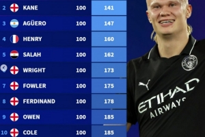 24直播网11月03日讯 德转盘点英超历史百球最快用时榜。哈兰德以107场98球高居榜首,有望刷新纪录。传统射手如希勒(124场)、凯恩(141场)等均位列其后,凸显哈兰德在英超的超高效率。